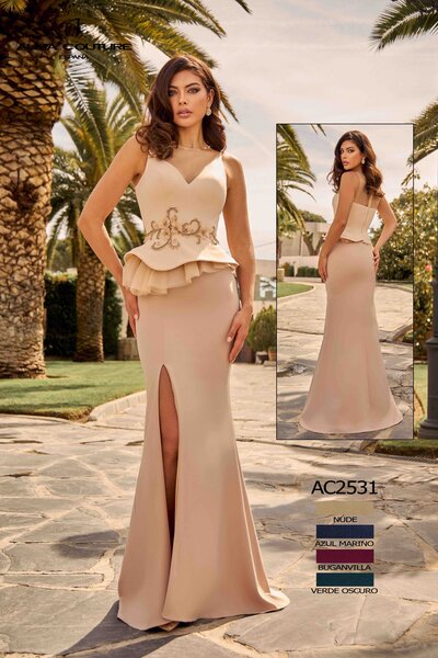 Abito a sirena con spacco, corpetto con rouge in 3d effetto tulle
