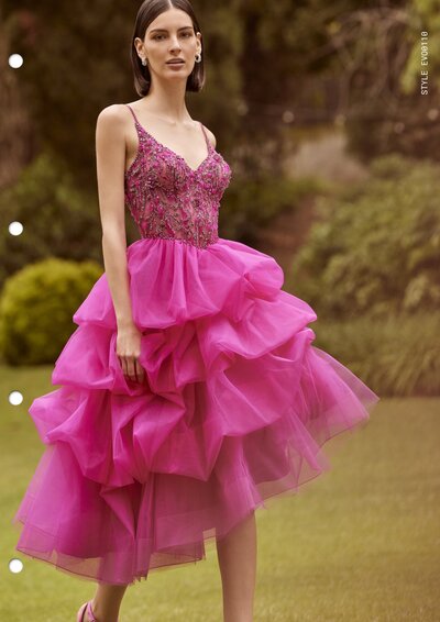 Abito longuette con corpetto steccato, applicazioni di pietre e perline , gonna con balze.