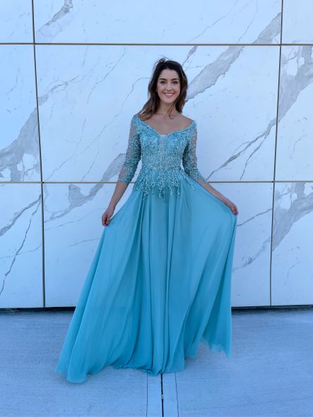 Abito con gonna scivolata in chiffon e corpetto lavorato.