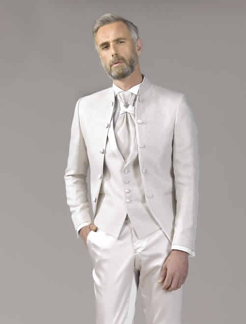 Abito da sposo, giacca con taglio coreano con borchie. Tessuto damascato per gilet, giacca e cravattone. Pantalone in tinta unita.