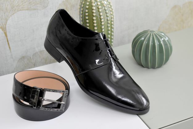 Stringata cerimonia/sposo artigianale in vernice e pelle lavorata, con cintura abbinata.